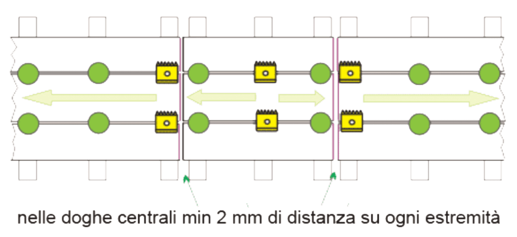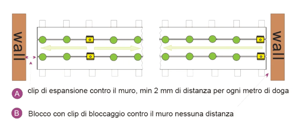 Le doghe centrali vanno fissate con la clip di bloccaggio al centro, mentre le doghe esterne devono essere fissate sempre con la clip bloccaggio nella parte in cui incontrano le doghe centrale, in tal modo la loro dilatazione sarà forzata verso l’esterno. Ricordarsi di lasciare sempre uno spazio di 2mm per ogni metro di doga dove sono presenti le pareti.